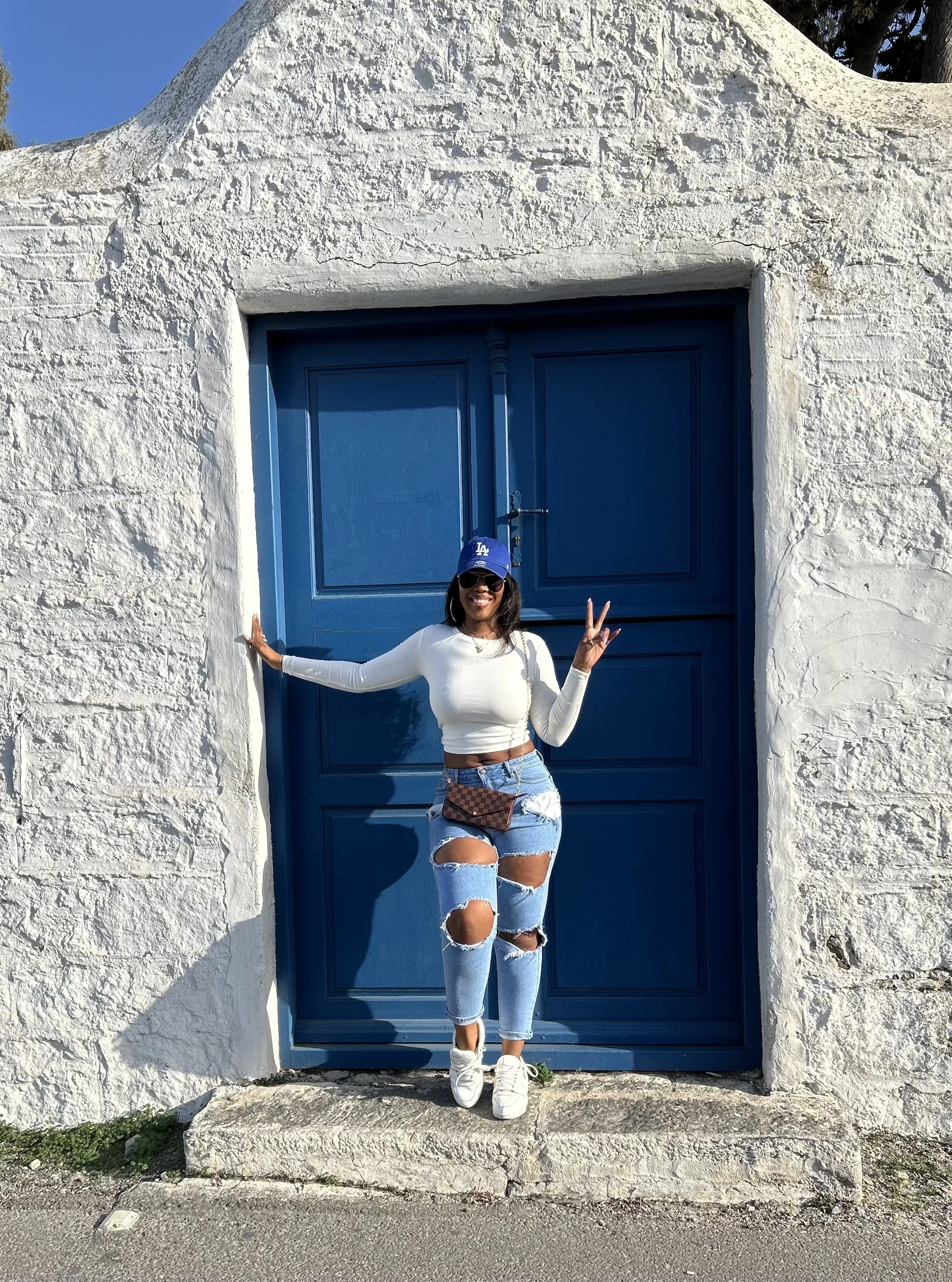 Woman standing in front of a blue door, wearing a white long-sleeve crop top, ripped jeans, white sneakers, a blue LA cap, and sunglasses, smiling and making a peace sign with her right hand.