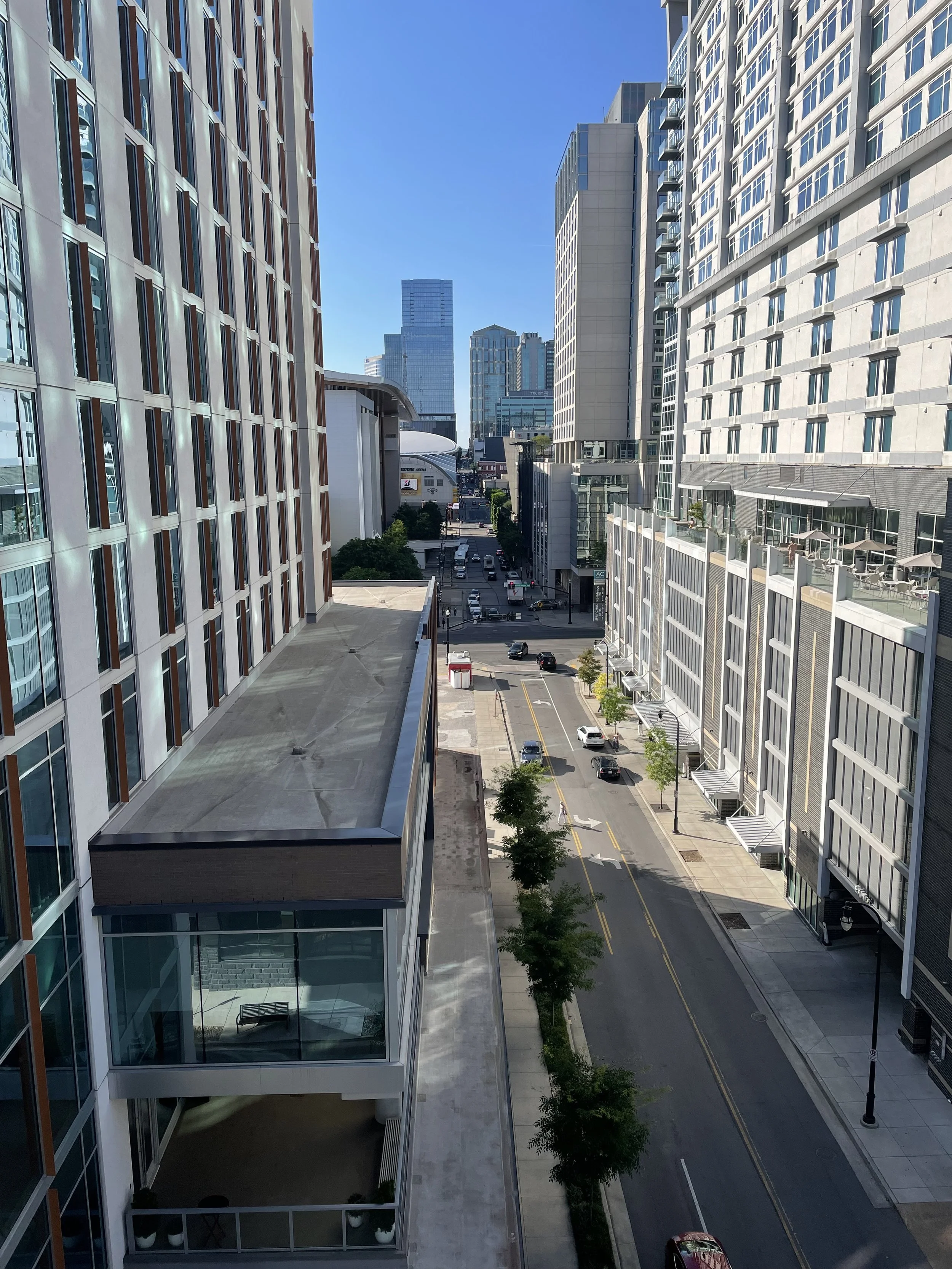 A view of a city street with tall modern buildings, parked cars, and a few trees, taken from a high vantage point on a clear, sunny day.