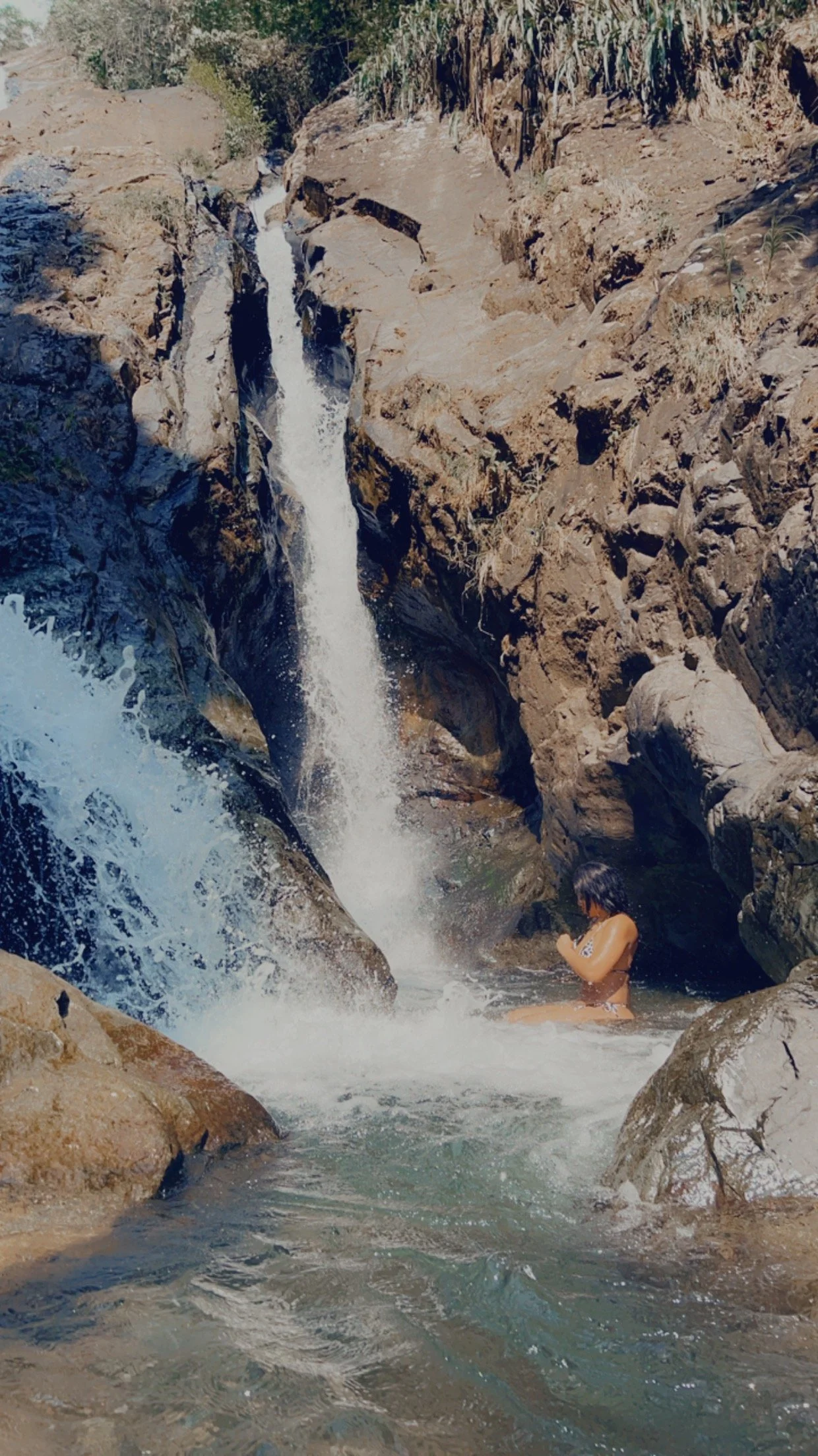A woman sitting on rocks near a waterfall in a rocky and natural outdoor setting.