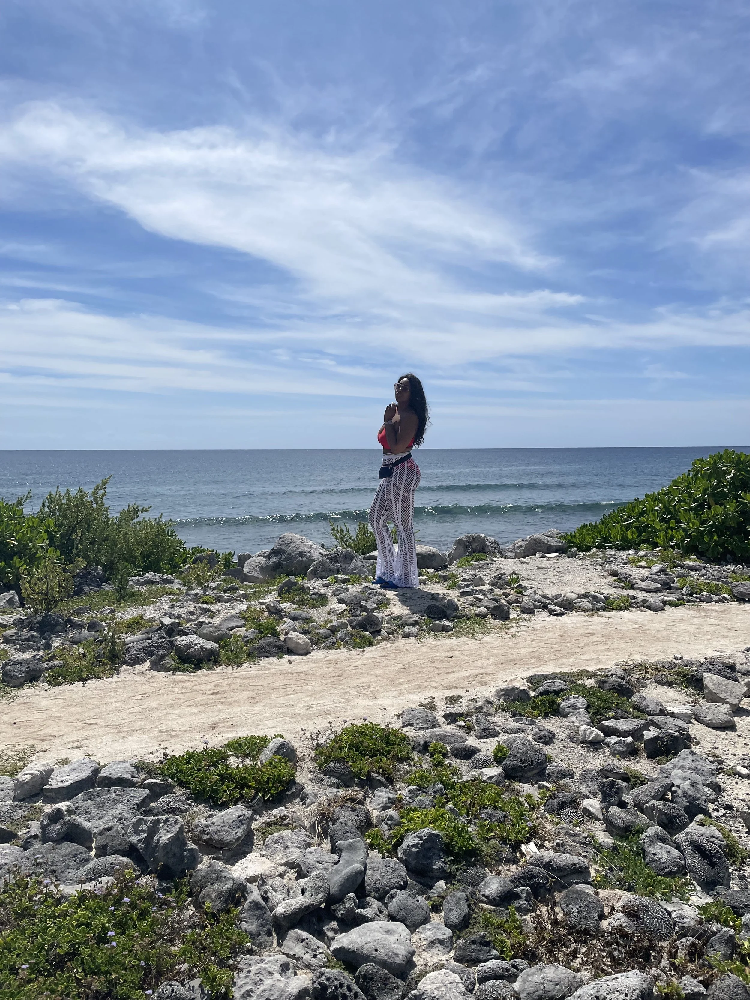 A woman standing on rocky beach near the ocean with a blue sky and scattered clouds overhead, wearing sunglasses, a red top, and wide-leg patterned pants.